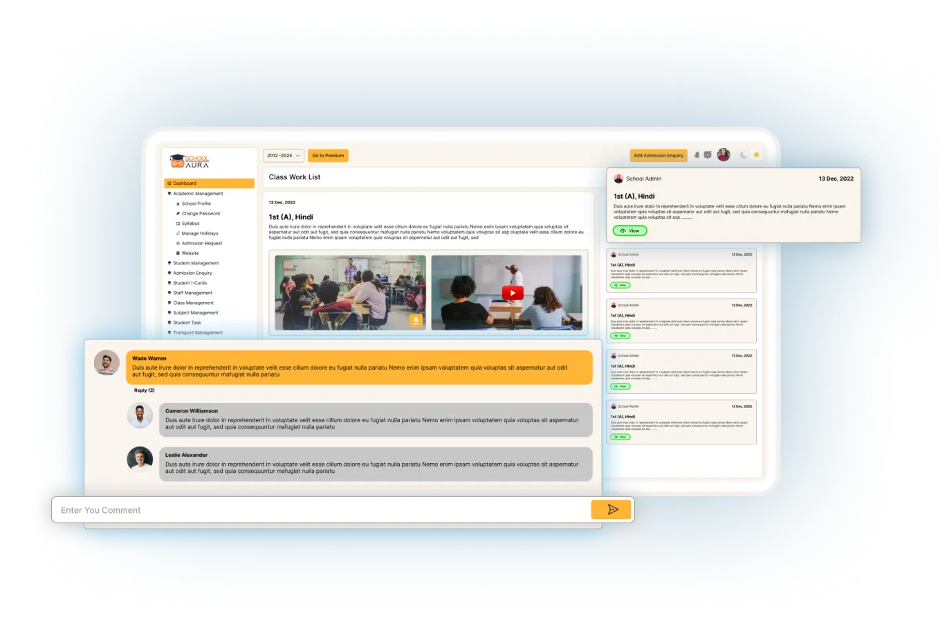 SchoolAura facilitates student's learning journey with appropriate curriculum planning, lesson planning, compliance all streamlined across the whole system to help develop student outcomes and administrative workflows. Academic management is the foremost crucial operation where the assessments and students' academic performance need to be managed well. Our student academic management software significantly reduces the workload and time spent by teachers on manual work. They can create question banks for various classes and upload files, documents. It becomes easy for the parents to check the grades and track the students' scores and performance on a regular basis. It also enables teachers to upload, share, track assignments and send reminders to students. Teachers can provide feedback instantly on the assessments and assignments.