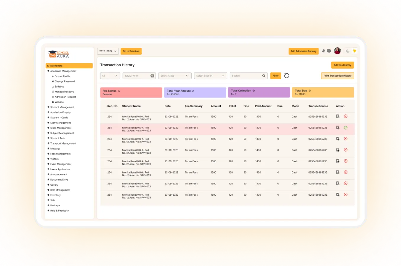 SchoolAura Fee management system enables schools to set-up the efficient fee management functions applicable across all the standards/classes within the school. The module offers flexibility to set-up fee heads and fee structures as applicable to different levels of class in the school. The system deals with Fee and its structure for various classes and gives them all the necessary details such as the calculated fees, due fees amount, extra fine charges etc.